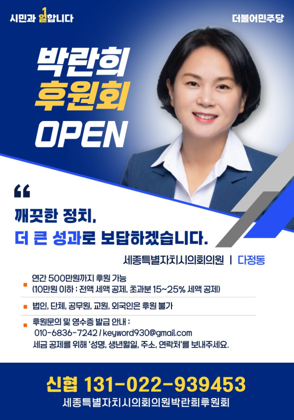 박 의원은 후보 등록과 동시에 후원회를 가동하며 깨끗하고 투명한 선거 문화 조성에도 앞장선다. “주민 한 분 한 분의 소중한 마음을 모아 정책으로 승부하는 선거를 치르겠다”는 그는 “보내주시는 응원이 다정동의 더 나은 내일로 돌아갈 수 있도록 더 낮은 자세로 뛰겠다”고 약속했다.