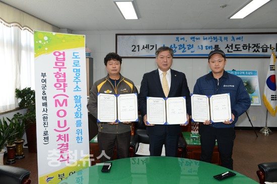 부여군은 지난 18일 군수실에서 내년 1월부터 전면 시행될 도로명주소 사용을 앞두고 도로명주소의 안정적 정착과 활성화를 위해 관내 택배회사(한진택배,로젠택배)와 협약을 체결했다.