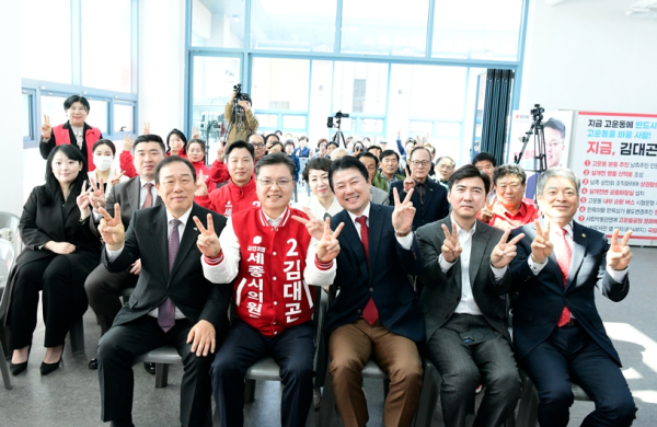 ▲조치원읍 제1선거구 윤여택, ▲전의·전동·소정면 엄현택, ▲고운동 서용숙, ▲보람동 박윤경, ▲반곡·집현동 이미경 예비후보와 ▲비례대표 송동섭 예비후보 등이 참석해 김대곤 예비후보와 함께 '원팀'으로서의 필승 의지를 다졌다.