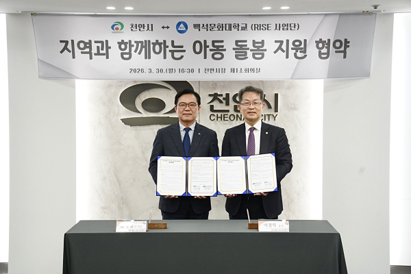 [충청뉴스 유규상 기자] 천안시는 30일 시청 소회의실에서 백석문화대학교(RISE사업단)와 ‘지역 인재양성 및 아동 돌봄 지원 협력 강화를 위한 업무협약’을 체결했다.