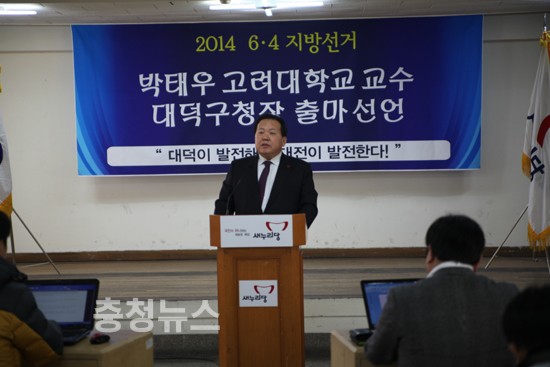 고려대학교 교수 및 대덕발전전략연구원(가칭)장 박태우 교수가 23일 오후 새누리당 대전시당 기자회견실에서 내년 6.4 지방선거 대전 대덕구청장 출마를 선언했다.