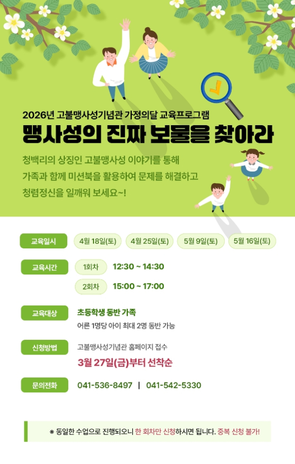 참여 대상자는 초등학생을 동반한 가족이며, 신청은 3월 27일부터 고불맹사성기념관 누리집을 통해 선착순으로 접수받고 있다. 세부내용은 고불맹사성기념관(☎041-542-5330, 536-8497)으로 문의하면 된다.