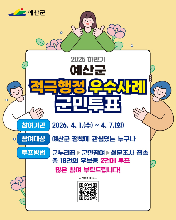 [충청뉴스 박영환 기자] 예산군은 2025년 하반기 적극행정 우수공무원 선발을 위해 4월 1일부터 7일까지 7일간 온라인 군민투표를 실시한다고 밝혔다.