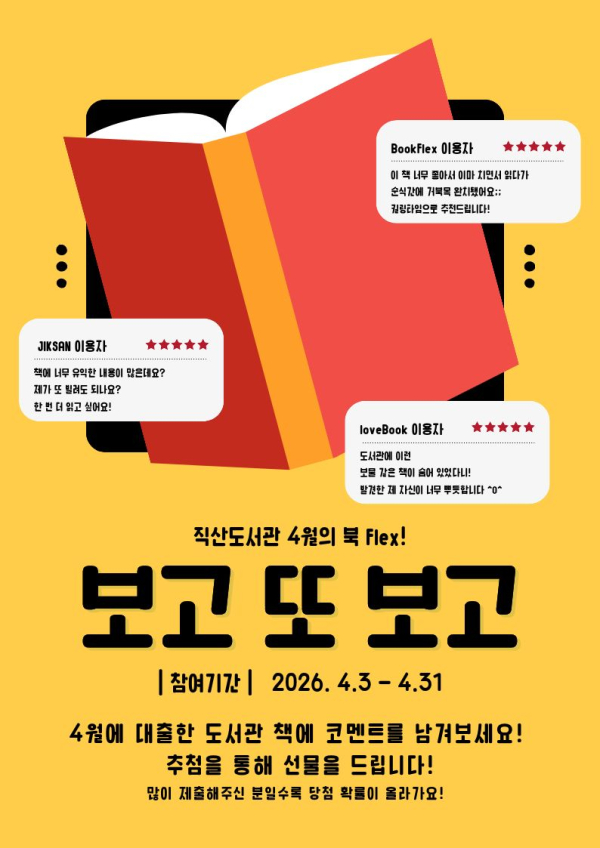 이달에는 자유롭게 서평을 남겨보는 ‘보고 또 보고’를 운영, 도서관에서 책을 빌린 후 직접 별점을 매기거나 서평을 적어 통합데스크 또는 전용 응모함에 제출하면 추첨을 통해 소정의 선물을 증정할 예정이다.
