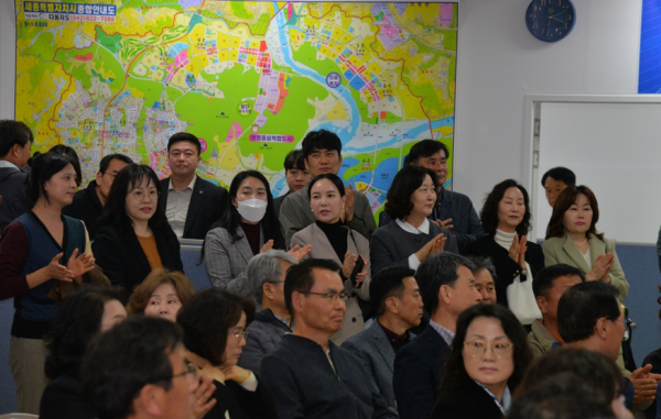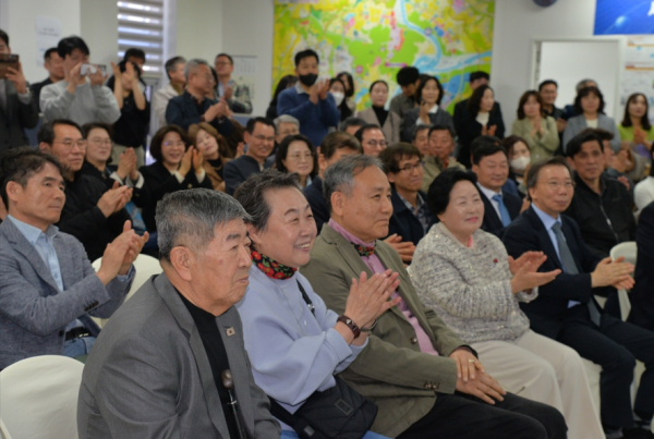 특히 강천석 사회적기업 세종우리협동조합 이사장, 이세영 변호사, 임재긍 주민생계조합(주)장남 대표, 양혜란 세종시어린이집연합회민간분과 회장, 유보경 세종갤러리 고운 관장, 전규미 리버파크어린이집 원장 등 지역 인사와 주민 300여 명이 참석해 인산인해를 이뤘다.