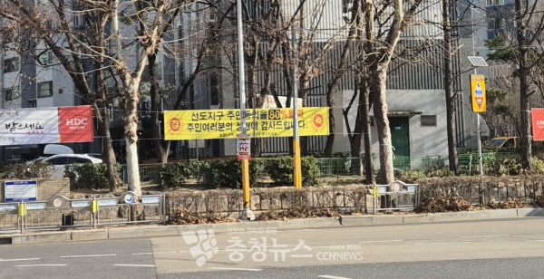 대전 서구 둔산동 한 아파트 외부에 선도지구 주민동의율 현수막이 설치되어 있다.