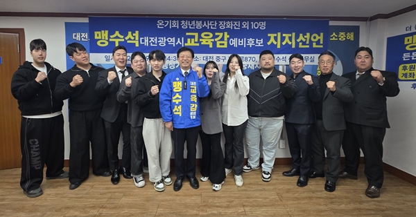 맹수석 예비후보측에 따르면 이날 온기회 청년봉사단은 “현장의 목소리를 반영한 정책과 실천력을 갖춘 맹수석 후보가 대전교육을 이끌 적임자”라고 밝혔다.