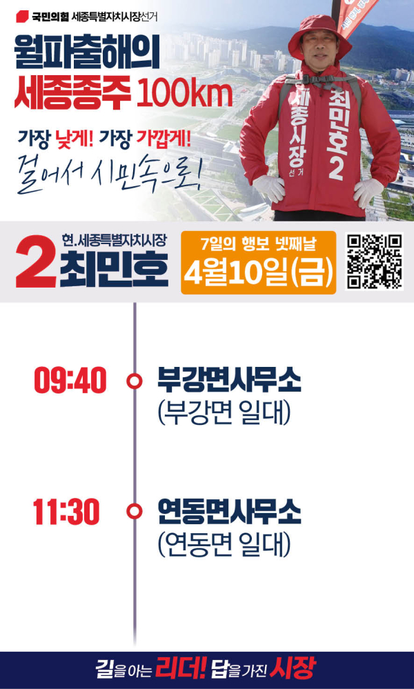 [충청뉴스 최형순 기자] 최민호 세종특별자치시장 예비후보가 ‘걸어서 시민 속으로’ 세종 종주 100km의 반환점을 도는 4일차 여정에 나선다.