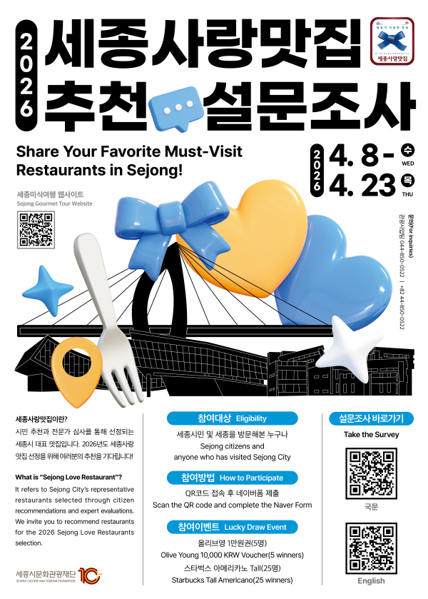 세종시문화관광재단(대표이사 박영국)은 오는 4월 8일부터 23일까지, 지역 미식 문화를 선도할 ‘2026 세종사랑맛집’ 선정을 위한 시민 참여형 설문조사를 실시한다고 밝혔다.