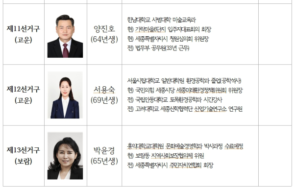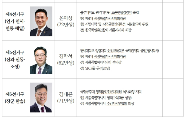제8선거구(도담·어진): 인재영입위원회를 통해 발탁된 정성헌 후보가 낙점됐다. 현재 입시학원을 운영 중인 정 후보는 전 어진동 주민자치회장, 현 세종시교육청 주민참여예산위원회 위원장 등을 역임하며 지역사회와 교육 현장을 아우르는 폭넓은 활동을 전개해 왔다.