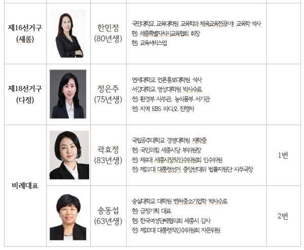 이로써 국민의힘은 세종시 17개 지역구와 비례대표 후보 공천을 마무리하고 선거 승리를 위한 진용 구축했다. 아름동 제9지역구는 추가로 공천할 계획이다.