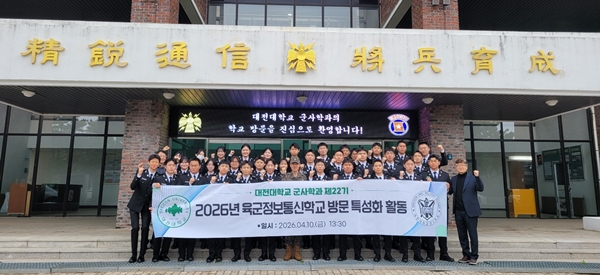 [충청뉴스 이성현 기자] 대전대학교는 군사학과 제22기 학생 33명이 최근 육군정보통신학교를 견학하며 현대 전장의 필수 요소인 군 정보통신기술(ICT)의 현주소를 확인하고 미래 전장 환경에 대한 안목을 넓혔다고 밝혔다.