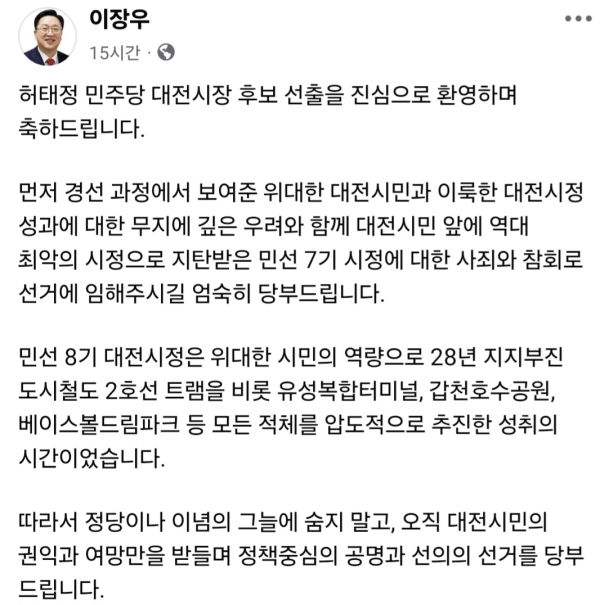 그러면서 “정당과 이념을 넘어 정책 경쟁을 통해 대전의 미래를 선택하는 선거가 돼야 한다”며 민주당과 허 후보를 향해 민선 8기 성과를 인정할 것을 요구했다.