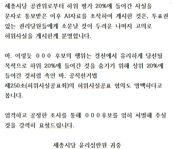 이에 따라 세종시당 윤리심판원에 ▲AI 자료의 입력값 및 조작 여부 ▲허위 사실 게시의 고의성 ▲경선 투표 결과에 미친 영향 등을 철저히 조사하여 법령과 당규에 따라 엄중히 처벌해 줄 것을 강력히 요청했다.