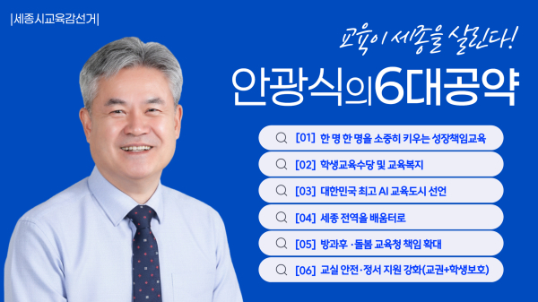 안광식 예비후보는 “이번 공약은 정부의 교육 개혁 과제를 세종의 현실에 맞게 내실화한 결과물”이라며, “시민들이 체감할 수 있는 변화를 만들기 위해 단계별 세부 실행 전략까지 꼼꼼히 준비한 만큼, 세종교육이 대한민국 교육의 표준이 되는 과정을 증명해 보이겠다”고 자신감을 내비쳤다.