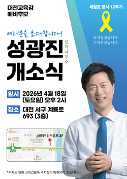 이날 성 예비후보는 기초학력 보장과 교육격차 해소, AI 시대 맞춤형 교육 등 대전교육의 질적 전환을 위한 3대 핵심 정책을 직접 공표할 예정이다.