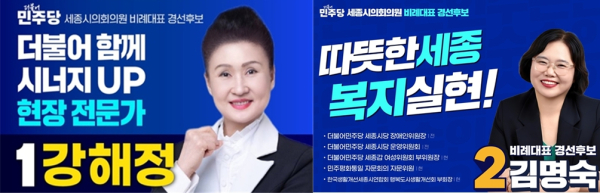 이번 경선은 교육 현장에서의 풍부한 경험을 쌓은 강해정 후보와 지역 복지 및 장애인 인권 전문가인 김명숙 후보의 2파전으로 치러진다.