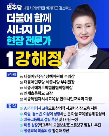 기호 1번 강해정 후보는 연세초등학교 교장과 세종시교육청 민주시민교육과 과장을 역임한 교육 전문가다. 현재 더불어민주당 정책위원회 부의장과 세종시당 부위원장을 맡아 당내 정책 역량을 발휘하고 있다.