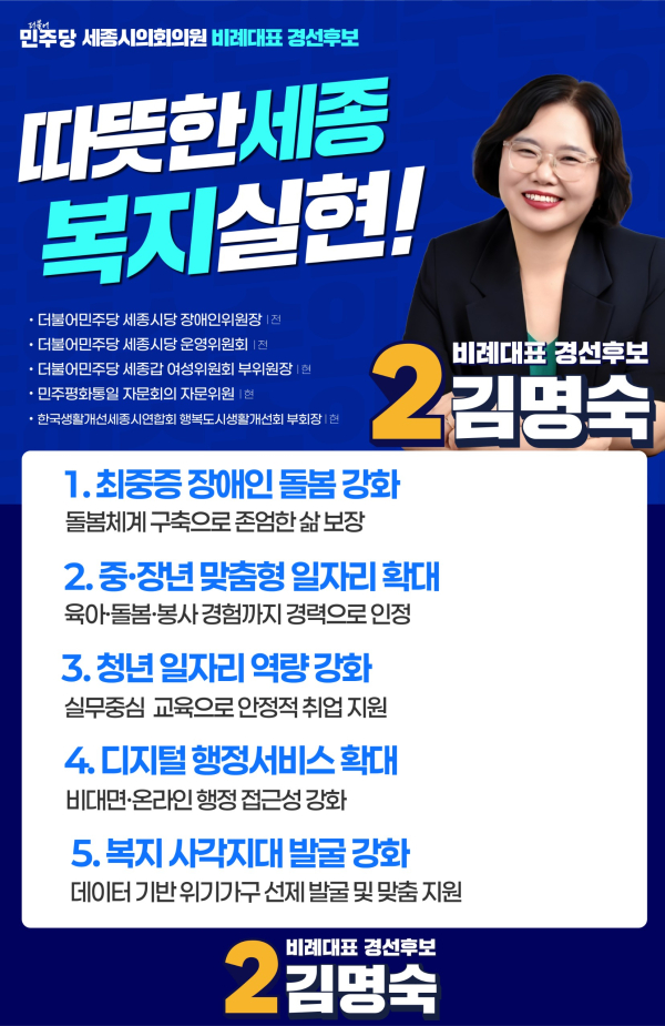 기호 2번 김명숙 후보는 세종시당 장애인위원회 위원장과 운영위원 등을 지낸 복지 전문가로 꼽힌다. 현재 세종갑 여성위원회 부위원장과 민주평화통일자문회의 자문위원으로 활동하며 폭넓은 지역 스펙트럼을 보유하고 있다.