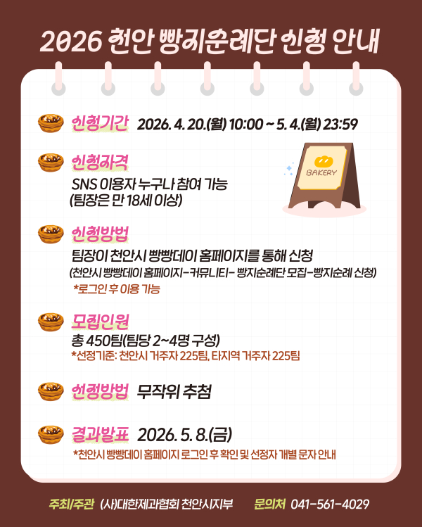 [충청뉴스 유규상 기자] 천안시는 오는 6월 13일부터 14일까지 이틀간 열리는 ‘2026 천안 빵지순례 빵빵데이’에 참여할 순례단 450팀을 내달 4일까지 모집한다.