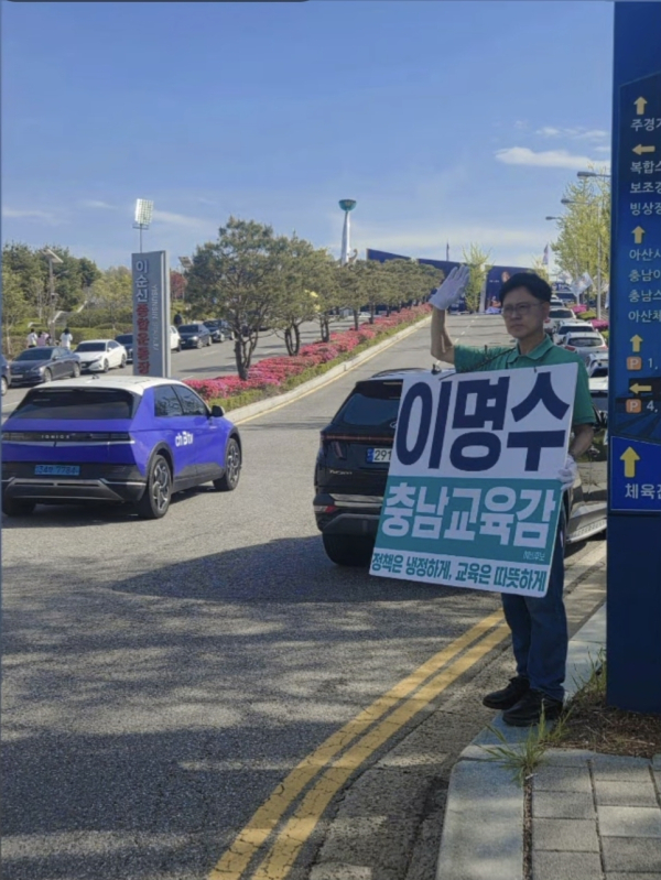 [충청뉴스 유규상 기자] 이명수 충남교육감 예비후보가 21일 아침 신정호 부근 도로에서 출근하는 시민들에게 아침인사를 하고 있다.