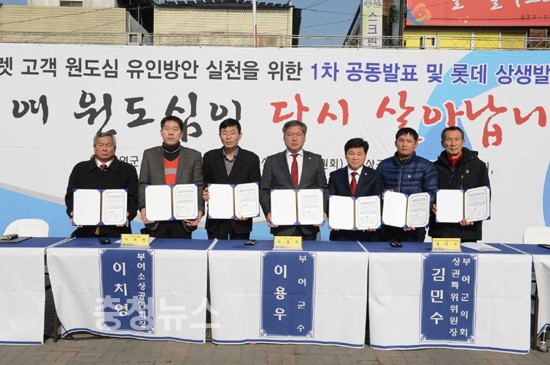 부여군(이용우 군수), 부여군의회(원도심 활성화 특별위원회 위원장 김민수), 부여군 상인회(5단체 대표)는 부여롯데아울렛 개장 이후, 아울렛을 찾는 고객을 부여원도심으로 유인하기 위한 차별화된 시책을 개발하고 실천력을 담보하기 위해 6일 부여군 중앙시장에서 ‘부여롯데아울렛 고객 원도심 유인방안 1차 공동발표 및 롯데 상생발전 촉구대회’를 개최했다.