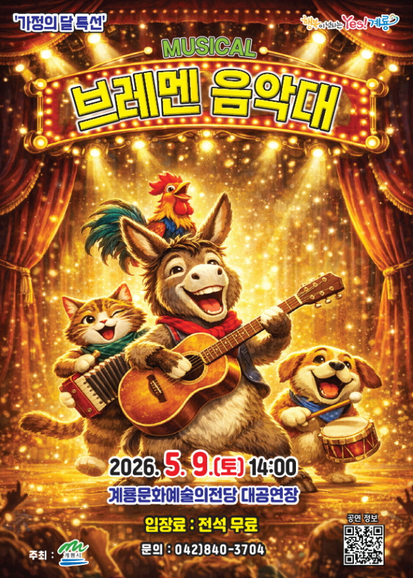 [충청뉴스 계룡 = 조홍기 기자] 충남 계룡시는 5월 가정의 달을 맞아 어린이 가족이 함께 즐길 수 있는 기획공연, 가족뮤지컬「브레멘 음악대」를 오는 5월 9일 오후 2시 계룡문화예술의전당 대공연장에서 선보인다.