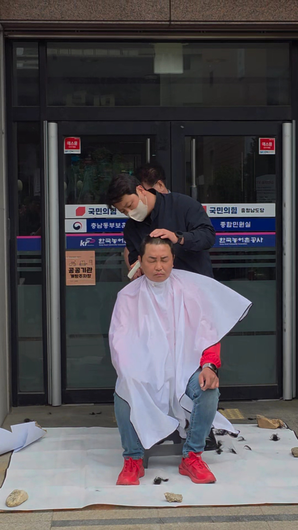 [충청뉴스 유규상 기자] 김철환 천안시의원이 27일 소속 정당 충남도당 앞에서 천안시 마선거구(성환·성거·직산·입장) 기초의원 공천과 관련한 ‘밀실 사천(私薦)’ 의혹을 강하게 규탄하며 삭발을 결행했다.