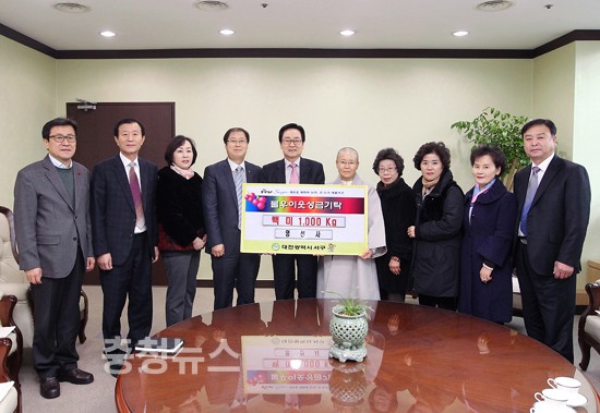 대전광역시 서구(박환용 서구청장)는 지난 7일 구청 다목적실에서 도마동에 있는 대한불교조계종 영선사(주지스님 현도)로부터 어려운 이웃을 위한 백미 1,000kg(10kg, 100포)을 전달받았다.