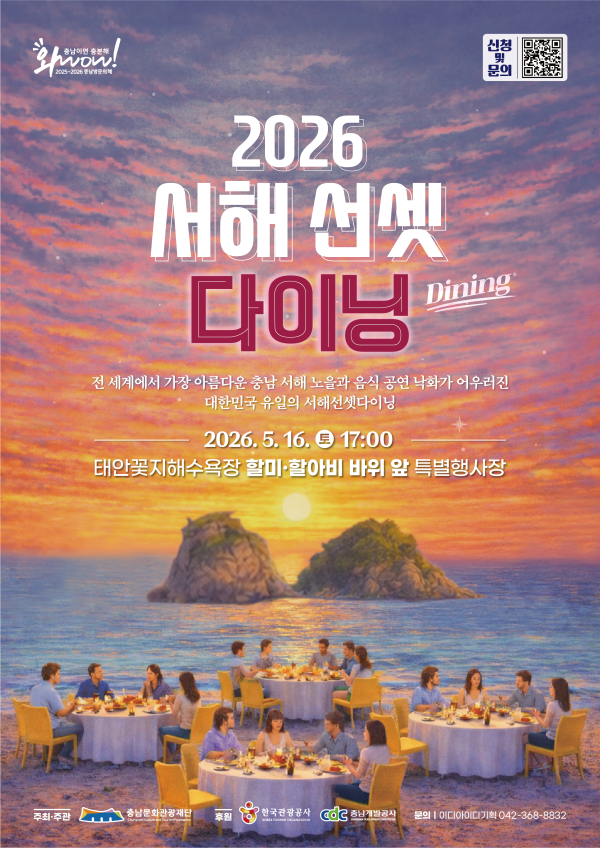 충남문화관광재단이 주최하고 한국관광공사, 충남개발공사가 후원하는 이번 행사는 이날 오후 5시 반부터 할미바위·할아비바위 노을로 유명한 태안 꽃지해수욕장에서 ‘노을에 빠진 충남 식탁’이라는 주제로 3시간 동안 진행된다.