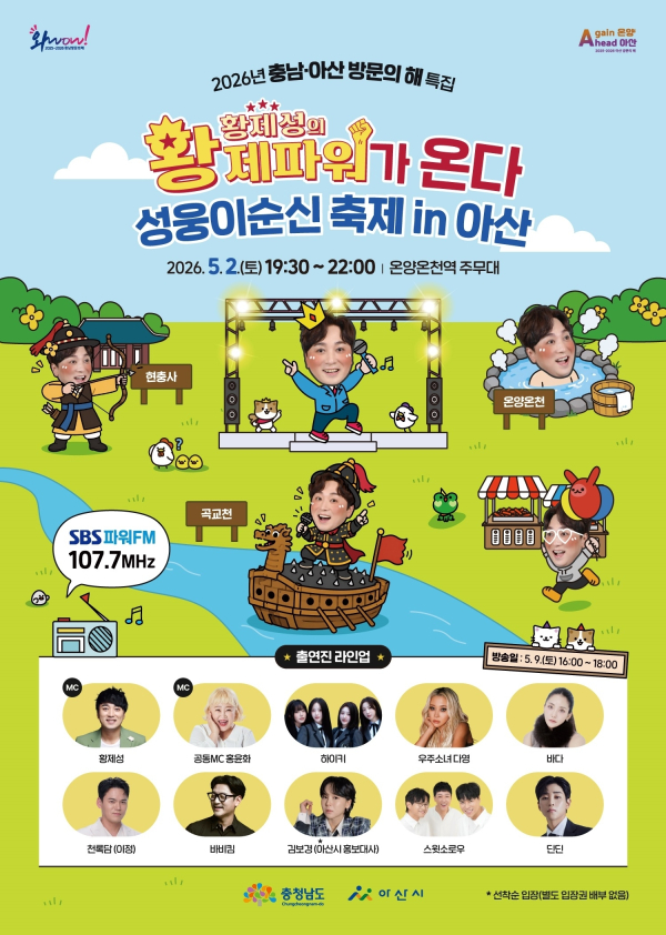 오는 5월 2일에는 인기 라디오 프로그램 SBS 파워FM ‘황제성의 황제파워’ 공개방송이 ‘제65회 아산 성웅 이순신축제’ 주무대인 온양온천역 현장에서 열린다. 아산에서 라디오 공개방송이 열리는 것은 2013년 ‘대한민국 아산 온천대축제’ 이후 13년 만이다.