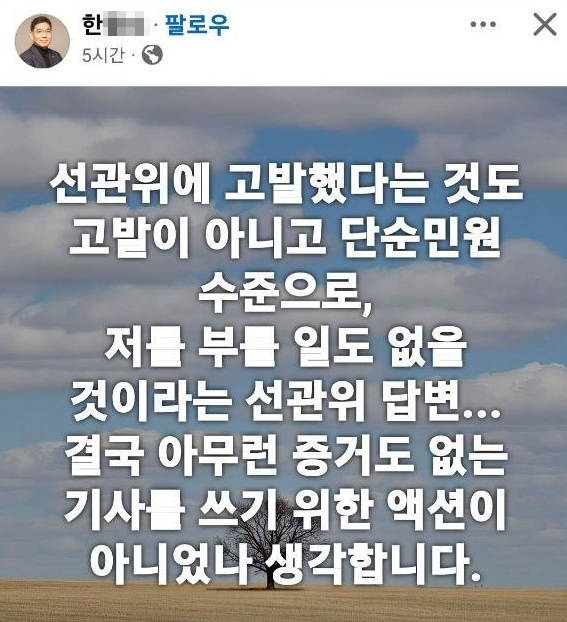 한태선 캠프 관계자는 “한 모 기자가 자신의 페이스북에 게시한 글에 따르면 선관위에 고발했다는 것도 고발이 아니고 단순 민원 수준으로 확인됐다. 마치 캠프가 조직적으로 개입한 것처럼 부풀려 보도된 측면이 크다”고 지적했다.