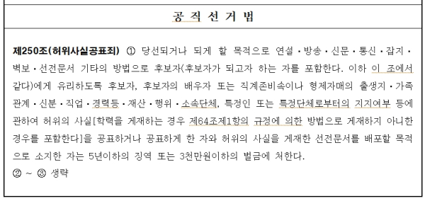 ▲공직선거법 제250조(허위사실공표죄) 제1항 - 당선되거나 되게 할 목적으로 연설·방송·신문·통신·잡지·벽보·선전문서 기타의 방법으로 후보자(후보자가 되고자 하는 자 포함)에게 유리하도록 허위의 사실을 공표한 자는 5년 이하의 징역 또는 3천만 원 이하의 벌금에 처한다.