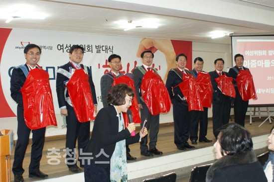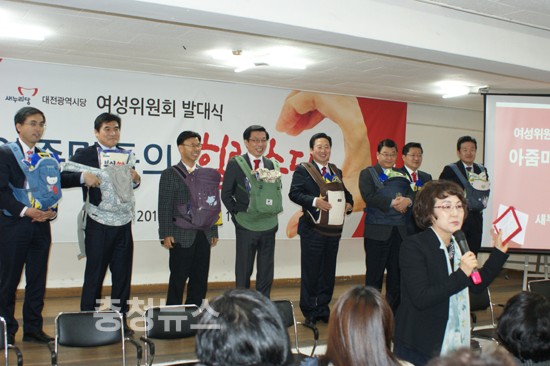 특히 이날 발대식에는 남성당직자들이 여성의 고충과 애환을 공유하는 시간으로 이뤄졌다. 이장우 새누리당 대전시당위원장과 이재선 새누리당 지방자치특별위원장 등 남성당직자 8명은 여성의 고충을 이해하기 위해 진행된 임신부 체험행사를 가졌다.