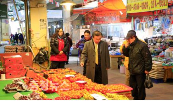 송용호 前 충남대 총장이 지난 11일 오후 재래시장 살리기 프로젝트의 일환으로 '장보고GO,신나GO' 캠페인을 벌였다.