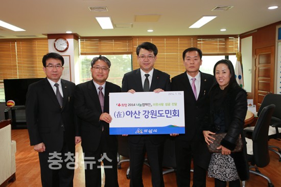 在 아산 강원도민회(회장 김태중)은 지난 15일 복기왕 아산시장을 방문해 '희망2014 나눔 캠페인' 이웃사랑 성금 50여만 원을 전달했다.