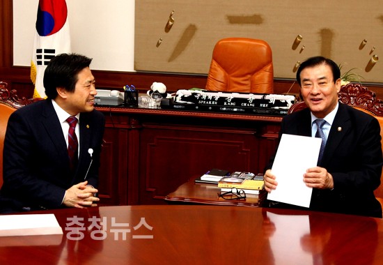 ▲ 김인홍<사진 왼쪽> 대전시 정무부시장에게 건의서를 전달받은 강창희 국회의장 모습.