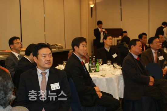 ▲심현영 시의원, 육수호 유성구청장 출마자,진동규,이재선 위원장 양홍규 정치대학원장이 이장우 위원장 축사를 청취하고 있다