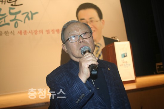 ▲ 유한식 세종시장이 25일 세종문화예술회관에서 열린'나를 지켜준 선한 눈동자' 출판기념회에서 인사말을 하고 있다.