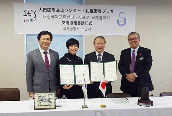 대전광역시 국제교류센터(센터장 이미숙·왼쪽 두 번째)는 6일 일본 삿포로 국제플라자에서 (재)삿포로 국제플라자(대표이사 나까다·왼쪽 세 번째)와 양 기관 관계자들이 참석한 가운데 민간교류 활성화를 위한 교류 협정을 체결했다.