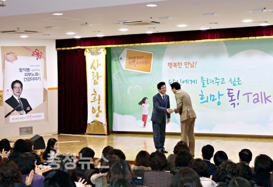 ▲ 12일 유성구청 대강당에서 열린 유성구 행복아카데미에서 허태정 유성구청장과 함익병 원장이 악수를 하고 있다.
