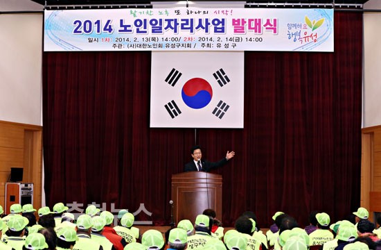 대전 유성구는 13일 노인회지회 대강당에서 노인사업참여자 300여명이 참석한 가운데 ‘2014년 노인일자리사업’ 발대식을 개최했다.