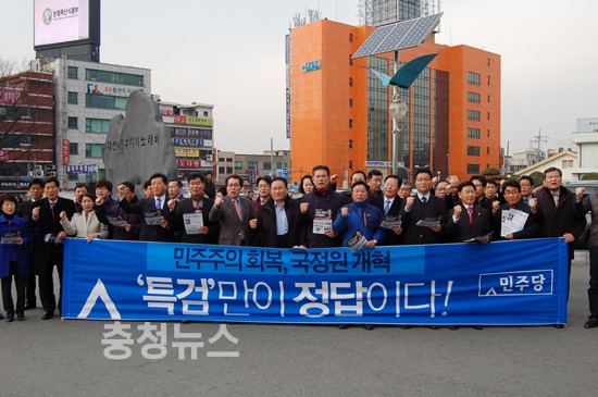 김용판 무죄판결 규탄 및 특검도입 촉구를 위한 전국 동시 거리홍보전이 16일 오후 대전역 서광장에서 이상민 위원장, 강래구, 이서령, 박영순 지역위원장, 권선택 대전시장 예비후보, 그 밖에 지방선거 출마예정자와 지방의원, 당직자 당원 등이 참석한 가운데 열렸다.