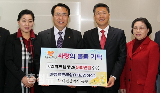 ㈜행복한세상(대표 김창식)이 17일 동구청(구청장 한현택)을 방문해 관내 다자녀가정 및 저소득 한부모가정 자녀를 위해 무역전시관 내 워터파크 입장권 350매(560만원 상당)를 ‘천사의 손길 행복+’를 통해 기탁했다.