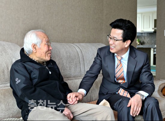 ▲ 허태정 유성구청장은 제95주년 3,1절을 앞두고 생존 애국지사인 정완진[왼쪽] 옹의 가정을 방문해 건강을 살피고, 존경을 표했다