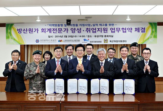 유성구는 26일 대덕이노폴리스벤처협회, 대전지방보훈청, 육군취업지원센터와 구청 중회의실에서 국내 최초로 방위산업 원가회계 전문가 양성을 위한 업무협약을 체결했다.