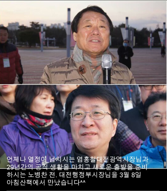 염홍철 시장과 노병찬 前 부시장이 아침산책 모임에서 첫 만남을 가져 화제가 되고 있다.