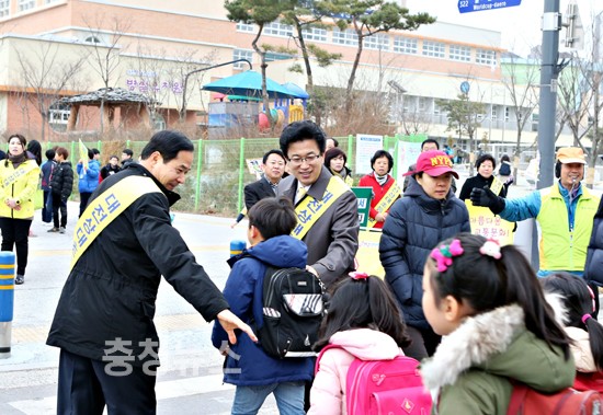 허태정 대전 유성구청장이 12일 오전 유성구 상대초등학교 앞에서 녹색어미니회와 학부모 등 50여명이 참여한 가운데 어린이 교통안전지도 캠페인을 하고 있다.