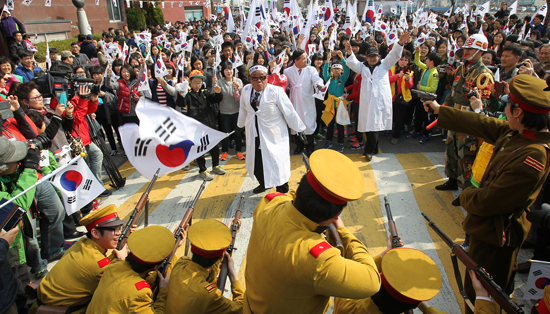 이와 관련 구는 16일 14번째 ‘3.16 인동장터 독립만세운동 재연행사’를 열고 2000여명의 참석자와 함께 대한독립만세를 외치며 선열들의 숭고했던 나라사랑 정신을 되새기는 뜻 깊은 자리를 마련했다.
