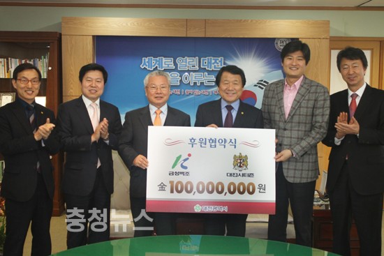 (주)금성백조주택은 20일 오후 대전 시청 사랑방에서 2014년 대전시티즌을 응원하기 위해 후원 협약식을 맺고, 후원금 1억 원을 염홍철 시장과 대전시티즌 김세환 대표이사에게 전달했다.